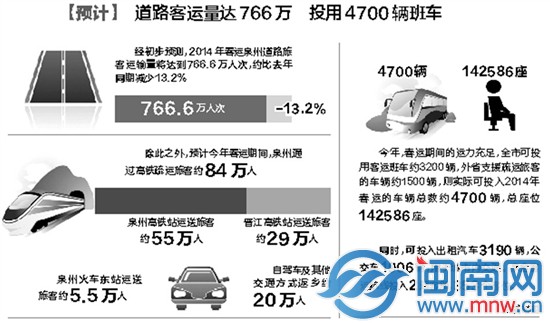 东南网1月4日讯(海峡都市报闽南版记者 苏碧蓉 通讯员 庄爱萍)昨日,泉州市交通委召开春运工作部署大会。今年春运将于1月16日启动,2月24日结束,为期40天,预计节前春运的高峰期将出现在1月23日~30日。春运期间,泉州道路旅客运输量将达到766.6万人次,约比去年同期减少13.2%。 【预计】 路客运量达766万投用4700辆班车 泉州火车东站运送旅客约5.5万人 自驾车及其他交通方式返乡约20万人 经初步预测,2014年春运泉州道路旅客运输量将达到766.6万人次,约比去年同期减少13.2% 除此之外,预计今年春运期间,泉州通过高铁疏运旅客约84万人 今年,春运期间的运力充足,全市可投用客运班车约3200辆,外省支援疏运旅客的车辆约1500辆,则实际可投入2014年春运的车辆总数约4700辆,总座位142586座。 同时,可投入出租汽车3190辆,公交车1906辆,用于城市内交通。泉金客运航线投入2艘客船,353个客位。 |
