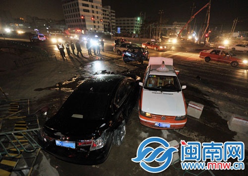 东南网1月16日讯(海峡都市报闽南版记者 涂传之 吕波 通讯员 张榜魁 文/图)已近午夜时分,一阵刺耳的摩擦声,伴着一道蛇形的火光过后,紧接着又是一阵激烈的碰撞声:红绿灯下3辆小车、1辆电动车和1名行人已乱成一团,被一辆黑色广本小车相继撞上。