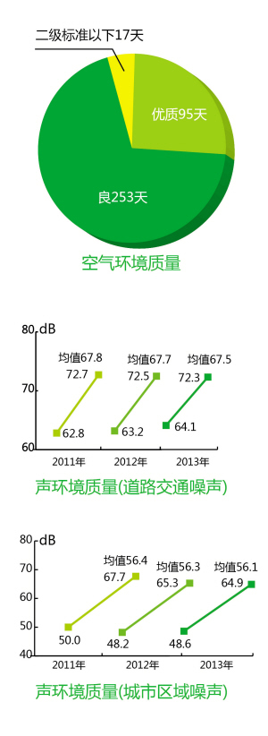环境质量分析图表 东南网3月24日讯(晋江经济报记者 阙杨娜 通讯员 张金典)昨日,记者从晋江市环保局了解到,《2013年晋江市环境质量状况公报》(以下简称《公报》)已经出炉。《公报》显示,去年晋江的空气质量继续保持优良水平,城市地表水和饮用水环境质量达标率100%,城市声环境质量总体保持较好水平。 全年好天气348天优良率95.3% 根据《公报》显示,去年晋江的空气质量达优的天数为95天,达良的天数为253天,全年优良以上的天数为348天,空气质量优良率为95.3%,达到国家环境空气质量的二级标准。 “这也就是说,晋江的空气比较清洁。”晋江市环境监测站站长蔡文进分析说,近年来,晋江不断加强对工业污染源的控制,尤其是陶瓷企业在去年完成了天然气替代后,很大程度上减少了二氧化硫的排放。此外,晋江的绿化率也在不断提高。所以,晋江的空气质量这几年都呈现向好的趋势。 那么,低于二级标准的17天,究竟是什么原因造成的?蔡文进说,去年晋江有出现几天污染比较严重的天气,主要是受雾霾北下等外来因素所影响。 不过,《公报》也指出,去年晋江出现酸雨频率为59.5%,主要集中在上半年,比2012年有所上升。