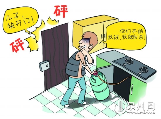 (黄晖/绘) 早报讯 (记者 吴水保 黄祖祥 通讯员 陈晖万 张绍澎)前日凌晨,晋江男子苏某赌博输光回家后,向老母亲伸手要钱被拒后,竟将自己反锁在厨房里打开煤气声称要自杀。好在民警和消防官兵及时破门而入,将苏某成功控制并送往晋江市疗养院接受治疗。 前日零时许,一女士哭着打电话向派出所报警求助说,“我儿子将自己反锁在厨房里,现在打开煤气罐要自杀,怎么劝都不开门,你们赶快过来啊!” 民警到达事发民房,就闻到一股强烈刺鼻的煤气味,进入屋内,只见其母在厨房外拼命捶打着门哭喊:“儿子,你赶紧开门啊!”为安全起见,民警将其母劝到民房外面。随后,消防官兵也到达现场。 民警来到厨房门外,只听到厨房内的煤气罐发出轻微的“吱吱”声,情况紧急。隔门与苏某谈话,民警安抚劝他开门。但苏某不听劝,情绪更加激动。为了尽快将苏某救出防止出现危险,民警联合消防官兵果断撬开房门,将煤气罐的阀门关闭,将苏某强行带到民房外。 据其母介绍,儿子苏某事发前从外边赌博回来,叫嚷着向她要钱,她不给,儿子便开煤气要自杀。此前儿子多次以跳楼、开煤气的方式威胁要钱,但都没有成功。基于苏某的精神异常状况,在征求其母的同意后,民警将他送至晋江市疗养院接受治疗。 |