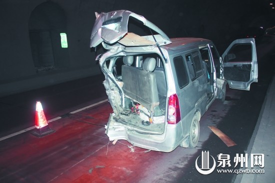面包车因爆胎在隧道内停下 车子在高速公路隧道内爆胎,司机在未在车后150米摆放警示标志的情况下下车换胎,结果惨遭后车撞击,伤情严重。 高速交警提醒,夏季行车要谨防车辆爆胎,在高速路上遇紧急情况,应在车后方设置警示标志,尽快撤离到安全地带,并打电话报警。 □早报记者 林志安 实习生 柯晓军 通讯员 黄颖 林富平 文/图 【事故】 隧道内换胎 司机被卷入后车车底 14日下午2时45分许,江西人王某驾驶小型普通客车(面包车)从江西要到泉州,行经泉三高速公路永春路段马跳隧道时,因为轮胎爆胎,停下来自己检修,结果被一部三明牌照的小货车碰撞,王某被卷入车底。 接警后,高速交警支队二大队民警立即赶往现场,经现场民警勘察和询问后得知,面包车司机发现车辆爆胎,无法前进,因此他停下车辆,准备就地换胎。就在王某准备换胎时,一部轻型厢式货车躲闪不及与之发生碰撞,车上乘员腰部扭伤,而王某因被卷入车下,伤势严重。 据了解,事发时车上有6人下车在旁等候,还有一人在车上。民警介绍,王某在车辆轮胎发生故障的时候,没有办法驶离隧道,未在车辆后方150米设置警告标志牌,仅仅放置了一个装有行李的“蛇皮袋”来进行警示;三明牌的小货车刮碰到面包车后,将面包车推行了十几米远,而在车旁修车的王某就被车辆刮带着拖行。 王某因为受伤较为严重,目前仍在ICU病房里接受抢救。