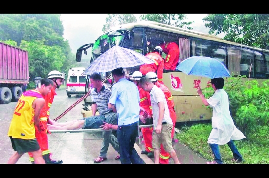 救援人员冒雨救助被困人员 本报讯 (记者罗剑生 通讯员康文斌 文/图)7月19日13时25分,安溪龙门镇省道206线龙门溪瑶村路段,一辆由安溪往厦门方向行驶的大客车与一辆牵引挂车发生碰撞,造成17人受伤及两车损坏的交通事故。 事故发生后,安溪县消防大队凤城中队迅速出动抢险救援车辆赶赴现场处置。消防官兵到场后,正下着大雨,只见货车在靠山体一侧,驾驶室撞击变形,司机受伤,没有人员被困;客车车头横在只有两车道的水泥道路边缘,车尾横在道路渣土路基边缘,濒临悬崖,大部分乘客已通过敲碎的玻璃窗逃生,司机和3名受伤的乘客被困车内。其中1名乘客头部血流不止,司机和另外2名乘客腿部受伤,动弹不得。 情况紧急,消防官兵和民警、医务人员立即展开救援,先是清理干净车窗上的玻璃碎片,然后利用梯子、担架等器材迅速将被困人员转移出事故客车,交由120医务人员送医救治。 据了解,大客车上包括驾乘人员一共有20人,3名驾乘人员梁某、林某、李某受轻伤,14名受伤乘客伤势比较轻微,大都是皮外伤。 目前,伤者伤情稳定,事故原因正在进一步调查之中。 来源:泉州晚报 |