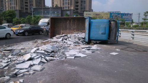 货车侧翻4吨石板堵路1小时 所幸车上两人未受伤