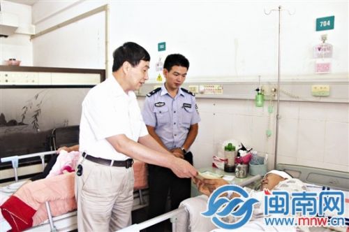 石狮市见义勇为协会副会长纪培忠慰问邱青山 相关新闻:石狮闹市一男子持刀连砍4人 母亲称儿有精神病 东南网9月24日讯(海峡都市报闽南版见习记者 林永清 通讯员 王伟斌 文/图)昨日下午,石狮市公安局传来消息,经过调查核实,正式确认18日清晨石狮闹市突发砍人血案中,两位夺刀的勇士邱青山、周万勇行为属于“见义勇为”行为,目前正准备相关材料向上级推荐表彰。 得知这一消息,两位勇士不约而同地说“这是应该的”,而邱青山还收到了一封手写的表扬信,赞他是“大侠”壮举。 石狮见义勇为协会 慰问两名夺刀勇士 昨日下午4时许,石狮市见义勇为协会组织相关人员,分别前往华侨医院和玉湖果蔬批发市场慰问邱青山和周万勇。 石狮市见义勇为协会副会长纪培忠告诉海都记者,他们为两人带去了慰问金,并带去了他们被确认为见义勇为的消息,两人听到这一消息后,都表示这是他们应该做的。 “该出手就出手,这是应该的!”在华侨医院,对于见义勇为协会的慰问,邱青山表示自己是一名党员,而且还当过兵,遇到这种事情时更应该出手。 而周万勇也很低调,他说自己平时就比较喜欢做好事,“路见不平,拔刀相助”对他来说都是很平常的,对于自己被确认为见义勇为,“这都是小事情,搞得太高调反而不好”。