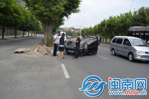 晋江一女司机变道车速太快翻车 路人帮开门救出