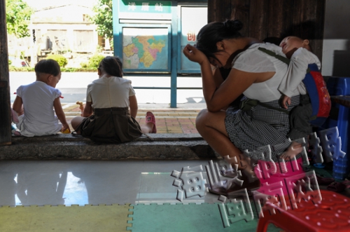 手术后,疲惫的郑玉春背着小女儿,坐在租房门口,两个女儿正在玩耍