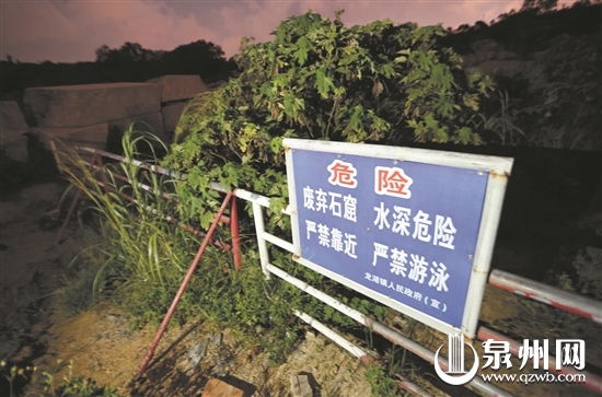 事发石窟 □早报记者 傅恒 戴晓晖 昨晚11点晋江龙湖报道 昨日下午6点多,11岁的江西籍男孩小韩与两名伙伴在晋江龙湖镇一废弃石窟内玩耍时,不幸溺水。事情发生后,另两名小孩赶紧跑出来求助并报警,但为时已晚,昨日晚上7点多,小韩的尸体被打捞上岸。 不幸:废弃石窟内玩耍 男孩沉入水中 接到线索后,记者赶到事发现场。事发地点是龙湖镇秀山村一个不规则的废弃石窟,石窟四面都被石头围住,四壁陡峭。在石窟边上,有一条小道可以通往石窟内,但小道口被护栏拦住,要想进入石窟,只能翻越护栏。在护栏旁边,挂着一块警示牌,上面写道:“废弃石窟,水深危险,严禁靠近,严禁游泳。” 据周边村民介绍,去年他们还看到有人在石窟内开采作业,今年就停了,以前石窟内水不多,这几天连续下雨,石窟内积水严重。 现场一知情人士告诉记者,事发时,有三个小孩在石窟边玩耍,其中一名男孩想蹚水走到对面,不幸沉入水中,见伙伴落水,其中一名小男孩拿着木棍想拉住落水男孩,但是没拉到。事情发生后,另外两名小孩赶紧跑出来求助并报警。 昨日晚上7点多,打捞队的工作人员在石窟中将小韩的尸体打捞上岸,目前小韩已被送往附近的殡仪馆。