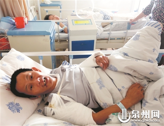夫妻在同个病房里接受治疗 “爸爸,妈妈,你们什么时候能回家陪我?”25岁的智障女儿每次来医院看望车祸受伤的父母,她不知道父母身上究竟发生了什么,一直重复着这句话,而躺在病床上的父亲周社生,忍不住想流泪。 52岁的周社生和妻子,多年来辛苦抚养二级智力残疾的独生女成人。本月10日,夫妻同骑电动车出门时与小车相撞,夫妻双双受伤住院。住院一周以来的医药费,除了小车车主垫付一部分外,其他都靠亲朋救济,而接下来的手术费还没有着落。 夫妻遇车祸同住院 无人照料只能请护工 在泉州市正骨医院骨伤科下肢二科病房,52岁的周社生和49岁的妻子苏美华躺在病房里,周社生双臂都包着绷带,右腿粉碎性骨折。苏美华头部受伤缝合,右小腿骨折,前两天刚做完手术。 周社生说,本月10日上午10时许,他骑合标电动车载妻子出门办事,行至市区田安路时,与一辆小车相撞,夫妻俩当场被撞飞后重重倒在地上。 “平生头一次遇上这样的事,整个人都蒙了。”周社生说,庆幸的是夫妻俩当时意识都还清醒,赶忙拨打报警电话,当天被送到正骨医院抢救。 周社生在泉州一家单位做保安,妻子在超市打小工,收入微薄,没有什么积蓄。家属四处帮忙筹钱,好在周社生所在单位的同事,同学和朋友听闻后及时伸出援手,各方努力下,先筹集了一笔医药费给情况较危重的妻子做了腿部手术。