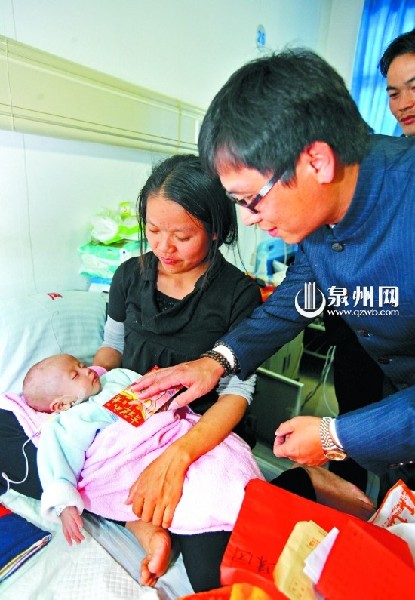 “这笔钱来自撞钟祈福现场,希望能给小洪彬带来福气,祝他早日康复,健康成长!”黄蓉萍说。2012年“海峡两岸撞钟祈福”活动由清源山管委会、清源山道观、东南早报主办,当晚,主办方在现场设置一个募捐箱,由读者自行捐资。撞钟活动结束后,主办方即清点出善款。因春节将至,小洪彬一家返回德化老家过节,直到日前小洪彬重返医院,主办方才将善款送上。