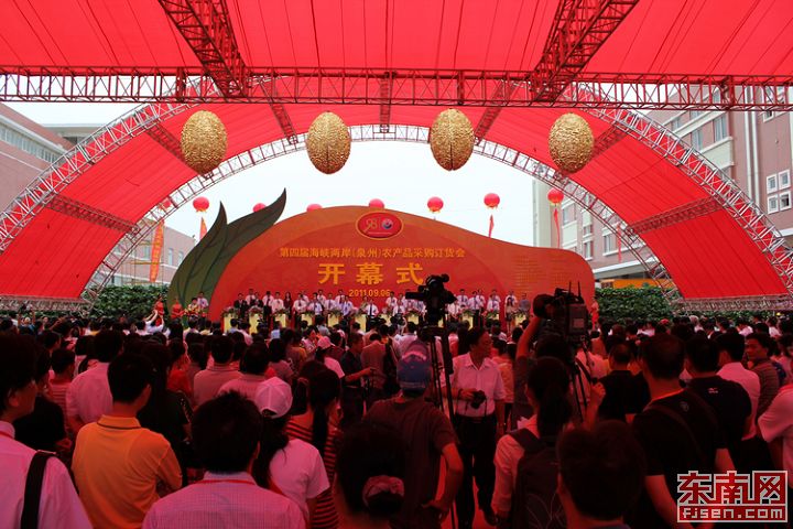 今天下午,第四届海峡两岸(泉州)农产品采购订货会(简称“农订会”)在南安市石井镇闽台农产品市场开幕。展会现场海峡两岸农产品琳琅满目,市民、客商在“大陆馆”和“台湾馆”流连忘返。图为开幕式现场人山人海。