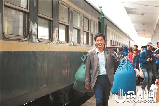 火车到站了,乘客挑着行李幸福回家。 (戴涵琦 摄) 回顾:“服役”风雨16年 见证泉州客运史 5218次列车渐行渐远,把车站远远抛在车后。原本热闹的车站又陷入了沉寂,它完成了自己的客运任务,从此告别了暑期、春运人头攒动,乘客通宵排队购票的历史。 回首过去,泉州火车东站见证了泉州客运的不少“大事记”。1998年底,泉州铁路总公司成立,泉州火车东站正式移交给铁路部门,并开通了泉州到龙岩的快速列车。1998年12月8日,车站开通泉州到武夷山的列车,成为泉州第一趟列入全国列车运行图的车次,开启了新的客运历史。2004年4月18日,泉州第一趟出省列车开通,直达湖北襄樊,泉州火车出省的“临客”身份终于转正,不久后又改为终点为汉口。2006年7月,东站引进到赣州的列车。从此,泉州火车东站主要运营到湖北汉口的空调车和到江西赣州的绿皮无空调车。2013年9月底,因向莆铁路通车,泉州东至武昌间的快速旅客列车K398停运。随着交通出行的选择多元化,泉州到赣州的5218次列车今日开始停运。 车站的工作人员,陪伴着泉州火车东站走过了风雨10多年的客运岁月。1997年,客运员林舟萍21岁,对于刚踏上工作岗位的她,一切都很新鲜。“第一天上班就是跟车,真的很兴奋。”她回忆,当年5月1日,泉州火车东站还是由泉州市地方政府主管,鉴于市民出行需求,泉州开通了到安溪清水岩的临时旅客空调列车,车站发出第一趟客运。“那是泉州开通的第一趟空调列车,而且可以广播点歌,用现在的话来说,就是很‘高大上’,很多市民都争相乘坐。”她清晰地记得,车上有9节硬座车厢,时速约20公里,不少人买了往返票,边乘车边兴奋地看风景。不过,运营了一年多后,这条临时客运线就终止了。