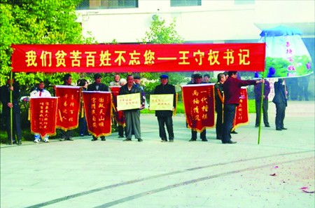 一篇图文并茂的博客文章透露,江苏泗洪县纪委书记王守权离任时,数百名群众自发地排着整齐的队伍,抱着铜匾,撑着“万民伞”,打着“清官旗”,集中在泗洪县政府门前用最古老的感恩方式为他送行。(12月2日《天府早报》)
