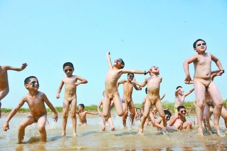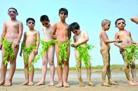 来自郑州一艺术中心的男孩女孩来到郑州花园口的黄河滩地,他们为配合“捐建孤老院”活动进行裸奔。大多数孩子兴致很高,非常爽利地脱下裤子跑到黄河滩地,光着身子跑来跑去,一不留神还能摔个屁股蹲儿。小女孩们只好羞涩地、羡慕地在一旁围观。活动发起人、行为艺术家赵半狄亲自给孩子们上妆——画上黑眼圈,意为“熊猫眼”。(8月7日《河南商报》)