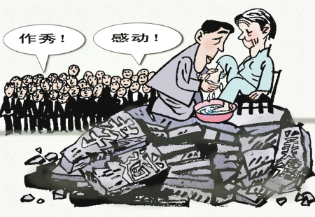 重庆丰都县一名校长在家长会上突然当着1200名师生和家长给母亲跪下洗脚,伴着《母亲》的旋律,一边洗一边教育学生理解父母操劳之不易。有的人落泪感动,也有旁观者质疑是替个人和学校炒作。这位校长则称当代学生“感恩的心太淡薄”。(1月19日《重庆晚报》)
