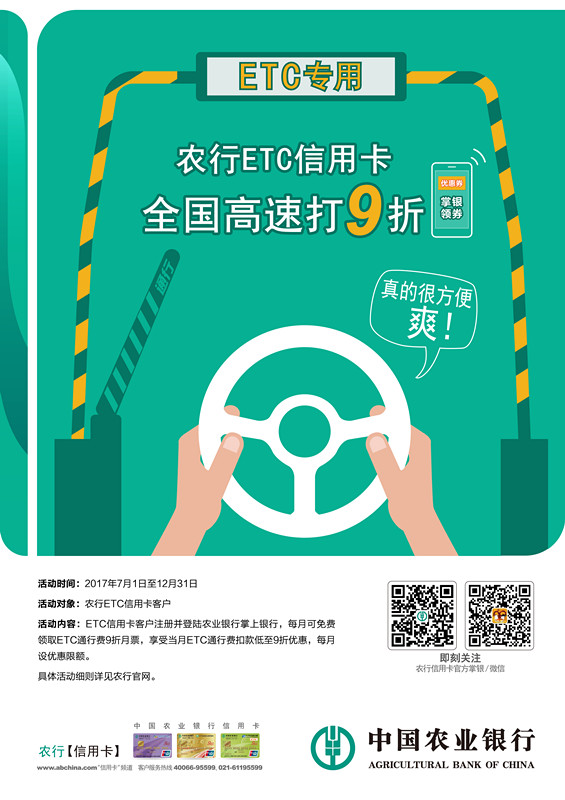 ETC海报 东南网三明10月5日讯 即日起至2018年12月31日,中国农业银行ETC信用卡客户注册并登录农行掌上银行,每月可使用1000积分领取ETC通行费月票,自领取之时起享受当月ETC通行费扣款低至9折优惠(每月设优惠限额)。月票数量有限,先到先得。 注意,领取月票所需的积分数将在掌银活动页面显示。月票领取后如未使用,扣除的积分不予退回。ETC通行费月票按月发放,从持卡人成功领取之时起生效至当月月底失效,在月票有效期内发生的ETC通行费扣款可享受折扣优惠。 |