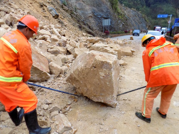 机械清理溜方(陈发仁/图) 险情发生后,永安公路分局立即启动抢险应急预案,分局安质、应急股人员与安砂站人员组成抢险小分队第一时间赶赴现场。为确保安全,抢险人员立即在溜方路段两端摆放锥形帽、设置安全警示标志,并安排人员在下坡来车方向进行交通疏导。同时,调动应急机械及装载车辆到现场对溜方落石进行清理,由于现场石块大,经人工破碎后,由装载机将碎石装上运输车,运往路肩外侧固定点堆放。 截止当天上午11:30分,共清理溜方约120立方米,道路恢复畅通。