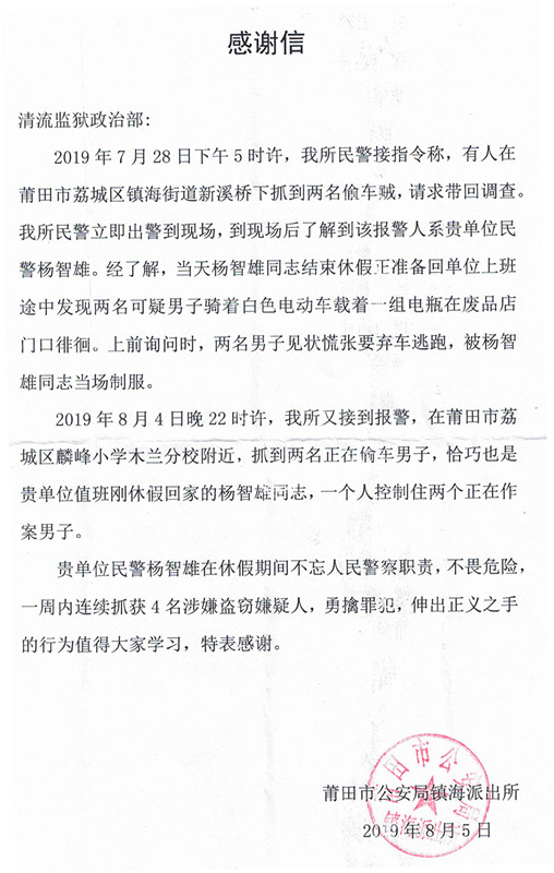 无独有偶,8月4日值班结束后,杨智雄便乘车往家里赶,晚上10时许妻子车站接他回家途中,经过麟峰小学木兰分校附近时,发现两名青年一前一后推着一辆电动车神色慌张地移动着,电动车坐垫也是掀起来的,不远处地板上还丢着头盔、票据、证件等物品。“看,这两个肯定又是偷车贼,老婆,靠边停车。”杨智雄职业敏感又涌了上来,警觉地对妻子说道。妻子配合地将车子停在路边并报警,杨智雄立马打开车门冲了上去,趁两名偷车贼毫无防备之际,先将后面一名偷车贼左手臂往前一拉,再迅速、敏捷、准确地将两人一左一右手臂死死往后一扣,大喝一声:“不许动,我是警察。”被死死扣住的两名偷车贼吓得一下跪在了地上,没等他们反映过来,杨智雄迅速将两人手臂死死缠住,不让他们有任何挣脱的机会。直到接警民警来到现场将两人拷上他才松开手,并将丢在地上的证件、头盔等物品捡起,根据票据打电话联系车主前来取车。一切都处理妥当后,他默默地和妻子离开了现场。 当地派出所发来的感谢信