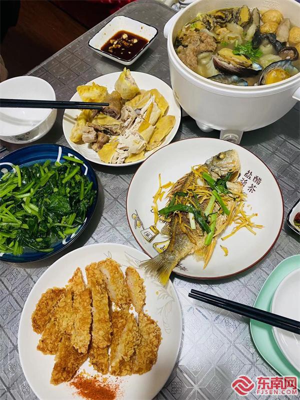 台商李秋银一家人的年夜饭。受访者供图 李秋银告诉记者,“今年是我在樱花园里过的第二个春节,是我公公(台商简文通)在这里过的第七个春节。我们家的年夜饭很简单,主要是一家人可以聚在一起,热热闹闹就行。”