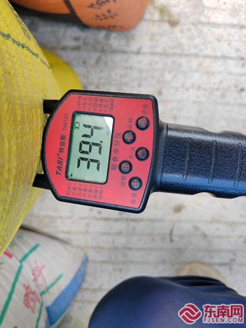 在盖洋镇杨地村吴地自然村“清优308”种植基地现场,一台收割机在田间来回穿梭,收割成熟的“清优308”低糖杂交水稻品种。明溪县农业农村局和盖洋镇农技站的技术员现场称重,并用“粮食水分仪”设备测稻谷的含水分,用卷尺丈量收割结束的田块面积。