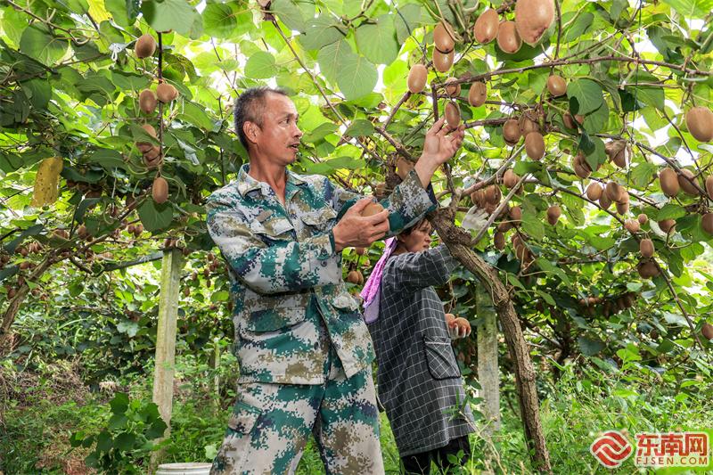 东南网8月29日讯(陈震 付哲文 文/图)8月28日,在建宁县溪口镇忘忧谷家庭农场,农户正忙着采收成熟的猕猴桃。