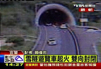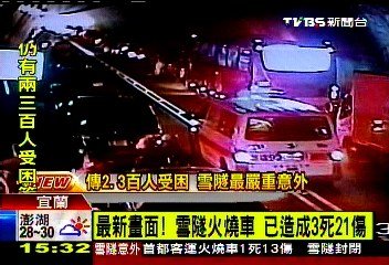 现场画面。台湾TVBS 中新网5月7日电据台湾TVBS报道,台湾雪山隧道通车以来,发生最严重的一起车祸意外,雪隧南下26.7千米处,下午发生火烧车意外,目前造成3死21伤,传有上百名民众受困于地下紧急避难通道当中;目前火势已经扑灭,但浓烟弥漫整个隧道,雪隧持续双向全线封闭,进行抢救。 |