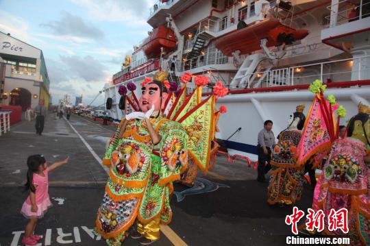 图为“东海救101轮”旁的“电音三太子”与一名台湾小女孩互动。 董会峰 摄