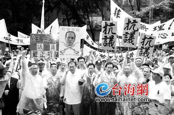 ◆数百渔民到菲驻台机构前抗议 东南网-海峡导报5月14日讯(海峡导报驻台记者 吴生林文/图)菲律宾野蛮枪杀“广大兴28号”上的台籍船员,且迟迟不愿作公开道歉及赔偿承诺,这让台湾岛内不满情绪持续升高,怒火排山倒海。昨天下午,包括从各县市聚集而来的渔民在内,约600名台湾民众到台北“马尼拉经济文化办事处”前投掷臭鸡蛋和鱼饲料,并焚烧菲律宾国旗,表达最强烈的抗议。马英九当局的反制也趋向更加强硬,除了12日派出“海巡署”、台军五舰南进护渔外,台军方昨天也下令,将把海军正常操演的地点南移到事发海域周边。 马英九13日再度表态,称该事件“让我们感到不可思议和非常的愤怒”,“我们很希望这件事情能够尽快落幕,因此要求菲律宾在72小时内对我们的要求作出响应,否则的话,我们不得不采取一些制裁的措施”。 昨天下午1点30分,全台约600名渔民代表在台湾“立法院”前集会。他们一方面对菲律宾表达强烈愤慨与谴责,同时也要求台当局对菲律宾采取更加强硬而有效的制裁措施,保护台湾渔民权益。民进党“立委”潘孟安与苏震清等人到现场声援。 苏震清批评马“政府”太软弱。他说,“广大兴28号”发生枪杀案后,菲律宾说是台湾船跑到他们的海域,而台湾却说是“重叠海域”,“为什么台湾不能说是我们海域”?潘孟安在接受媒体访问时更是呼吁马“政府”,应该让台湾海军封锁事发海域,不准菲律宾的任何渔船与公务船进入。 |