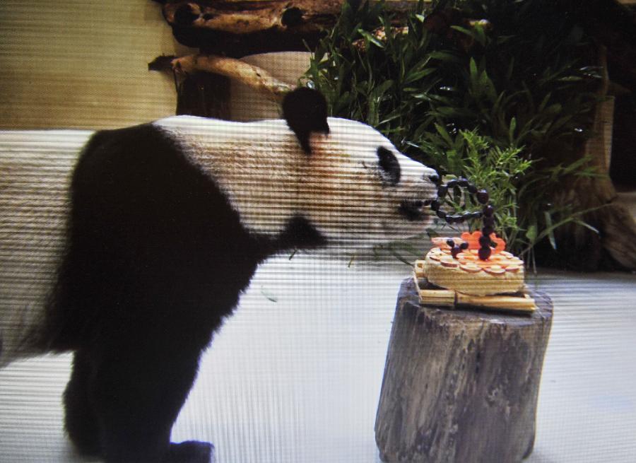 8月31日,大熊猫“圆圆”在享用动物园工作人员特别为它制作的“生日蛋糕”(翻拍自台北动物园提供的视频)。当日,大陆赠台大熊猫“团团”和“圆圆”在台北市动物园度过了它们的9岁生日,品尝了工作人员特别制作的生日蛋糕。据介绍,“团团”和“圆圆”生日相差两天,园方折中选择31日为刚刚升格做父母的它们庆祝生日。由于“圆圆”正在哺育出生不久的“圆仔”,当天并未与游人见面。新华社记者鲁鹏 摄 |