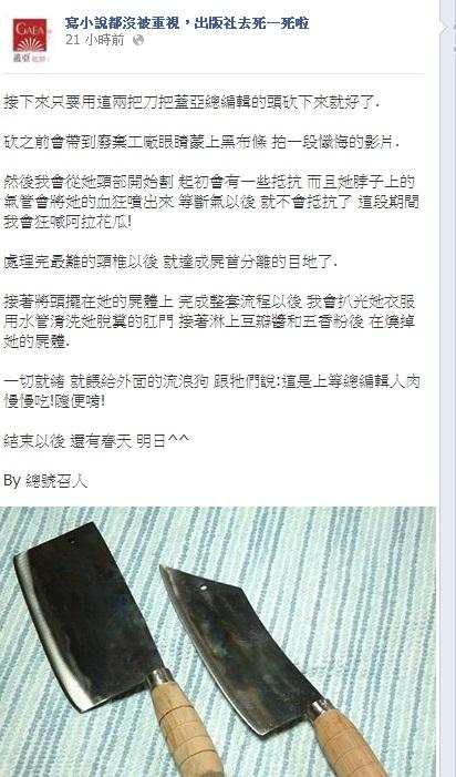 东南网3月5日讯 据台湾媒体报道,有网友疑似对知名作家九把刀以及其所属的盖亚出版社不满,竟在脸书成立粉丝团,恐吓要在3月9日烧掉出版社、砍总编辑,引起出版社人员的担忧。 一名男子在脸书成立“写小说都没被重视,出版社去死一死啦”粉丝团,甚至留下多篇表示要对盖亚出版社不利的文章,不仅写出要在3月9日烧掉出版社,还说要伤害总编辑等耸动言论。 据报道,这名男子疑似因投稿出版社,但没有被录用,才会愤而留下这些激烈的言语,有多名网友也遭他辱骂、盗图。 其中一名受害网友2日晚间向台北市警局报案,并对粉丝团管理人提出妨害名誉告诉,警方确认网页涉及恐吓、攻击、侮辱等言论后,依法受理报案,将会约谈网页管理人到案说明。 |