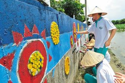 中新网4月18日电据台湾《联合报》报道,台湾云林县林内乡义峰高中多媒体动画科3年级50多名学生,藉由制作专题融入小区,在艳阳下挥汗为邻近学校的六旺农场彩绘围墙,呈现太阳花、火车头、山羊、花草等美丽活泼图案,师生主动美化环境,深获好评。 “感谢师生为围墙注入新生命!”六旺农场负责人张景滨说,他的农场养鸡、种稻、还设有荷花池,但邻近马路长达120公尺、高1.7公尺的围墙,却显得单调又生硬,经义峰师生用心彩绘,顿时成了五彩缤纷的景观墙。 “以废弃保特瓶盖黏贴太阳花造型最具特色”,学生廖翌晴说,墙面设计理念是运蔗铁道穿越乡村、越过梵谷的星空,在水面上映出几何图形倒影,并搭配日前学运活动,适时融入太阳花、校徽在墙面上,呈现传统乡村融合现代化风格。 校长王安顺表示,学生们利用每周两次专题制作,共5次约费时2天半时间完成彩绘美化农场围墙,除活化学校课程、美化小区,并让学生们自主化、做中学习与成长,师生的用心值得肯定。 |