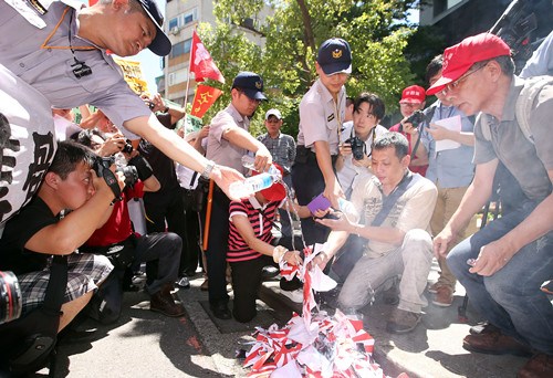 中新网7月7日电今天是卢沟桥事变77周年,据台湾“中央社”报道,“两岸和平发展论坛”等台湾团体今天前往位于台北的日本交流协会,抗议日本解禁集体自卫权,活动在日方代表接下抗议信后平和结束。 据报道,抗议活动由“两岸和平发展论坛”及“中华两岸和平发展联合会”发起,7日上午10时在日本交流协会前举行,现场集结大约百余人,警方不敢大意,在日本交流协会前管制并隔开抗议民众。 “两岸和平发展论坛”召集人兼台湾劳动党主席吴荣元及多名劳动党干部带领成员高呼“勿忘七七事变”、“维护亚洲和平”与“反对日本行使集体自卫权”等口号,还焚烧日本内阁总理大臣安倍晋三肖像,但遭警方立即用水浇熄。 吴荣元递交抗议信,由日本交流协会总务室主任村田一久代表接受,并回应会转达意见。 |