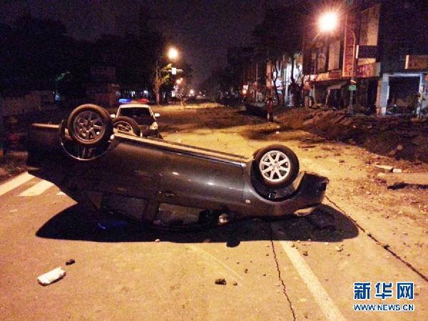8月1日,一辆汽车被掀翻在街道上。 7月31日晚,高雄市前镇区多条街道陆续发生可燃气体外泄,并引发多次大爆炸,数条街道被波及,至午夜时分气爆更加严重。新华社发