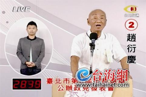 东南网11月30日讯(海峡导报驻台记者 林静娴)台“中选会”昨晚公布“九合一”选举结果,出乎很多人意料的是,78岁的无党籍候选人赵衍庆最后获得15898票,是台北市市长选举的第3高票,远远超过知名作家冯光远。 赵衍庆原籍山东,1949年跟随国民党来台,近20年来,他一直以开计程车和拾荒为生,之前曾参选过两次“立委”。 |