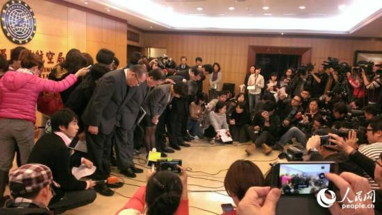2月4日台湾复兴航空公司一架从台北飞往金门的客机今日上午在起飞后坠河,复兴航空执行长陈欣德下午率复航高层召开记者会,会前所有干部鞠躬道歉。陈欣德说,深深感到抱歉,致上十二万分歉意。孙立极摄 图片来源:人民网