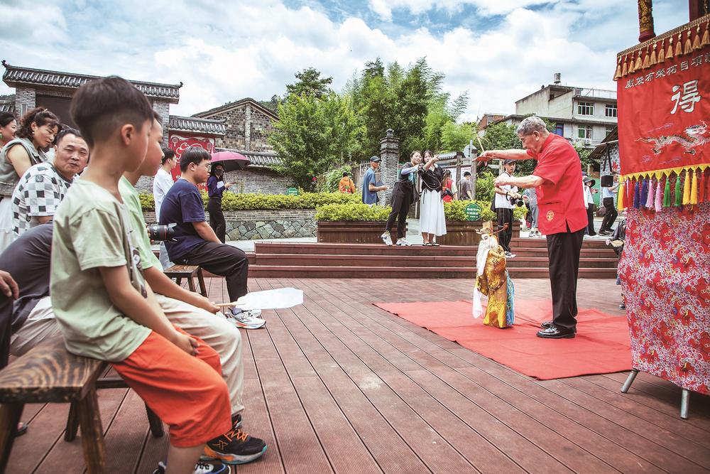 村民和游客正在观看提线木偶戏表演。 郑育红 摄