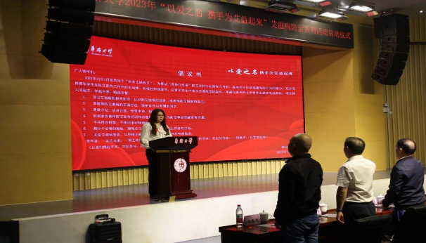 世界艾滋病 12月1日是“世界艾滋病日” 11月28日下午,“以爱之名 携手为艾益起来”艾滋病防治系列活动线下启动仪式在华侨大学顺利召开! 此次出席线下启动仪式的嘉宾有泉州市疾病预防控制中心相关领导、丰泽区疾病预防控制中心相关领导、华侨大学预防艾滋病健康教育工作领导小组相关领导,华侨大学学生处、校团委、数学科学学院、校医院相关负责人以及泉州市高校青春红丝带学生联盟、华侨大学青春红丝带协会、华侨大学数学科学学院团委学生会、华侨大学广播台等单位相关负责人。 下面一起来回顾会议议程 华侨大学副校长许志勇致辞