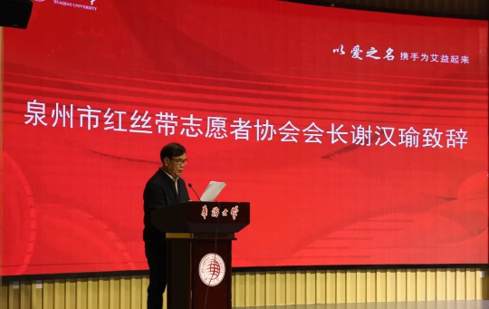 许志勇副校长讲到,加强高校艾滋病防控工作,不仅是促进学生健康成长的需要,也是促进校园和谐稳定,更是促进学校发展和建设的需要。我校历来高度重视防艾宣传教育,成立了青春红丝带服务队、承办了全国“美好青春我做主”红丝带青春校园行等活动,多年来坚持引导广大学生志愿参与预防艾滋病宣传教育活动,有效提高了学生的艾滋病预防意识,营造了健康和谐、积极向上的校园防艾氛围。接下来,学校也将继续巩固健康第一的教育理念,加快构建高质量的卫生与健康教育体系,为提升师生健康素养,助力师生健康成长和终身发展奠定坚实的基础。 泉州市红丝带志愿者协会会长 谢汉瑜致辞