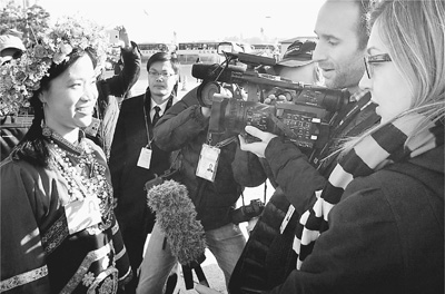 3月13日,第十二届全国人民代表大会第二次会议在北京闭幕。图为头戴花环的少数民族代表接受外媒记者采访。人民视觉