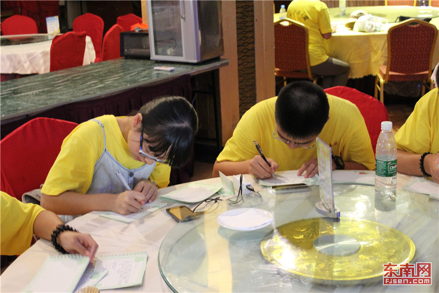 由于当天的活动是美国华裔青少年夏令营在福建参观、游览的最后一站。因此,整天的活动都被“临别”的氛围所笼罩。中午时分,所有美国华裔青少年都趁着休息的空档,聚集在酒店餐厅,用纸和笔认真写下了自己对于其他团员的祝福。