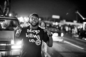 身穿写着“停止杀戮我们”上衣的抗议者,聚集在弗格森市一条街道上。