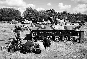 乌克兰士兵在顿涅兹克市附近修理坦克。