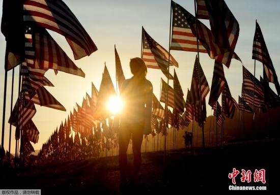 当地时间2014年9月9日,美国加州马里布,佩珀代因大学的学生和教职工竖起3000面美国国旗,纪念9·11事件中的约3000名受害者。