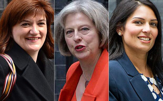 从左到右分别是英国教育大臣尼克·摩根、内政大臣特雷莎·梅和可能将在内阁改组中获提拔的普利提·帕泰尔。