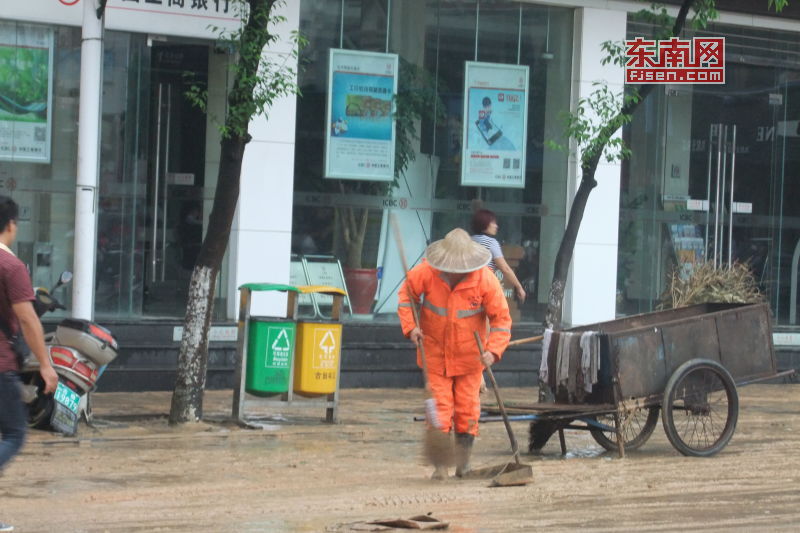在十字街,一位环卫工人正冒雨在清扫地面上的垃圾:“我们先负责清理垃圾,等下处里还会派洒水车冲洗路面淤泥。”