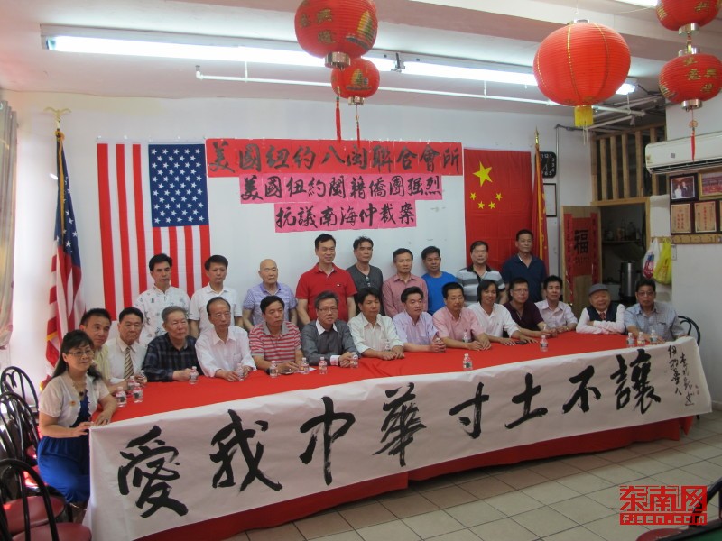 东南网7月16日讯 (本网特约记者 纽约墨人)7月15日,美國閩籍僑團抗議南海仲裁案在紐約八閩聯合會所舉行,我们海外华人华侨坚决支持中国政府的立场,不承认、不参与、不接受。所谓的仲裁是非法的,坚决反对以仲裁方式解决南海争端。希望国 际社会能够正视中国政府和人民的合理诉求,尊重历史事实。以有关国际条例为准则,通过和平协商、对话的方式解决争议,呼吁菲律宾政府以中菲关系发展和地区和平稳定大局为重,与中国政府一道通过谈判和平解决争端。坚决拥护中国政府关于南海的领土主权和海洋权益的声明。南海自古以来就属于中国的,任何妄图分裂祖国破坏统一的行径都不能得逞。中国南海,寸土不让!參加今天出席的侨领有美国纽约八闽联合会所主席刘爱华,美国福建同乡会名誉主席郑棋,美国福建长乐南乡联合总会会长陈文,美国福建商会会长林慈飞,美国长乐沙京联合总会主席李在雲,中国旅美经贸总商会主席张胜旺,美国金峰联合总会主席黄亮健,美国长乐五中校友会主席张小琳,美国长乐北山联合总会主席卓代振,美国妈祖基金会主席朱荣斌、美国福建闽侯工商会主席赵燕山等僑领先后发言。 美国中国书法家协会主席李兆银特别书写“爱我中华,寸土不让”榜书作品,支持中国政府的立场,维护中国及各国在南海的领土主权和海洋权益。 美國福建同鄉會名譽主席鄭棋,今天我們在這里聚集閩僑社團堅決反對南海仲裁案,這個仲裁法庭審理不符合聯合國憲章,沒有得到聯合國同意的法庭,是菲律賓政府的單方面行動。南海的主權歸屬是中國,歷史上明確記載著中國南海,做為在海外的中華兒女堅決支持中國政府對南海主權的決定與決心,「中國疆土一寸也不能少」,讓那些陰謀搞南海不安定的國家死了心。太平洋之大可以容納中美兩國共同開發,為南海的穩定與發展,中美兩國人民的和諧與團結,為世界和平共處,中美兩國之間應該按事實說話,保護南海主權是世界中華兒女共同的責任。世界上有2/3的國家已經證實南海是中國的!這是我們祖國的領土,我們堅決捍衛國家領土完整和主權! 美國福建商會會長林慈飛發言:我们旅美华人华侨坚决支持中国政府的立场,不承认、不参与、不接受。所谓的仲裁是非法的无效的,这场闹剧已收场。我们坚决反对以仲裁方式解决南海争端。坚决拥护中国政府关于南海的领土主权和海洋权益的声明。南海自古以来就属于中国的,太平岛是岛不是礁。南海仲裁案作出的裁决不过是一张废纸。中国是南海的主人,老祖宗留下的南海寸土不能让,不能丢!紐約八閩聯合會所劉愛華發言:坚决支持中国立场 南海诸岛自古以来就是中国固有领土,海内外中华儿女坚决支持中国政府对南海仲裁案不接受、不参与、不承认、不执行的立场。呼吁菲律宾政府以中菲关系发展和地区和平稳定大局为重,与中国政府一道通过谈判和平解决争端。 美國長樂南鄉聯合總會主席陳文發言:日前,菲律賓前政府單方面提出南海仲裁案所謂的裁決,是一个荒誕的政治鬧剧。中國政府聲明了不參與不接受不承認的严正立場。得到了國際社会70多国家國際組织的支持与理解。南海自古是中國領土的一部分,南海是中國人民的祖宗海,是吾祖吾宗用生命与智慧開创的偉大基业,中國虽大,但一寸不能少。丟了就丟中國魂丟中國梦丧失中华民族尊嚴。我們堅决拥护中國政府为捍卫祖國領土完整海洋权益及國際法治精神所做的不懈努力。贊成中國政府真誠通過協商解決糾紛,維持世界及地区的和平。 美國長樂二劉聯誼會主席發言:我代美国二刘联谊会强烈对抗南海仲裁案坚决支持中国政府的立场坚决拥护中国政府关于南海的领土主权和泊洋权益的声明。 中國旅美經貿總商會主席張胜旺發言:7月12日,国际海牙法庭南海仲裁庭对南海海洋纠纷的裁决出炉了,这个裁决满足了菲律宾所有的无理要求。声称,中国对九段线的历史权利没有法律依据,声称中国在黄岩岛不拥有专属经济区,声称中国在黄岩岛的海域侵犯菲律宾的传统渔权,声称太平岛是礁不是岛等等,无理的裁决,不仅无效,而且立即降低了该法庭的权威性,我认为这是国际反华势力上演的一段闹剧。目的只有一个就是要阻止中国的崛起,然而有幸的是我们有习主席的领导,习主席具有毛泽东主席所赞尝的“数风流人物,还看今朝”的英雄气概,不怕事,不闹事,坚决维护正义,维护世界和平,敢与强权一决雌雄,“今日长缨在手,何惧虎豹犲狼。南海诸岛,自古以来就是中国领土,中国在南海的领土主权和海洋权益,在任何情况下不受所谓菲律宾南海仲裁案裁决的影响,我们坚决走和平发展道路在尊重历史事实的基础上,根据国际法通过谈判协商和平解决有关争议,我们坚决拥护中国政府的一切主战张。 美國長樂五中校友會主席張小琳發言:南海诸岛自古以来属于中国的固有领土,中国对南海拥有无可争辩的主权。是我们中国人最早发现,最早命名,最早开发经营並连续不断地进行行政管辖。南海仲裁案却声称“中国对九段线的历史权利没有法律根据”;声称“中国在南沙群岛不拥有专属经济区”;声称“中国在黄岩岛海域侵犯菲律宾的传统鱼权”;声称“太平岛是礁不是岛,仅能宣称12海里领海”。这不是颠倒黑白吗?太岂有此理了!所以我们坚决反对“南海仲裁案”,要坚决捍卫祖国的领土完整,老祖宗留下