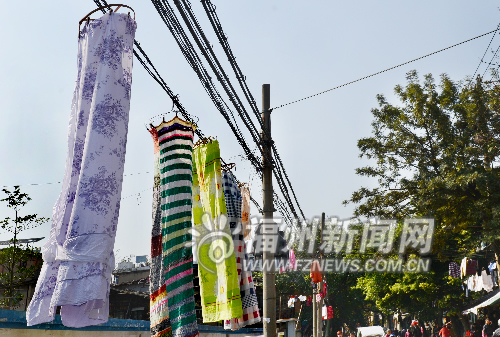 台江洋中路,市民在电缆上晾晒被单和衣服。