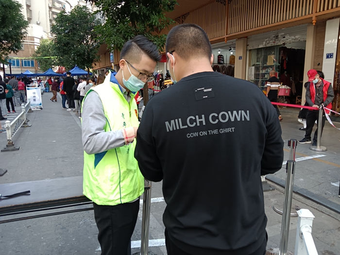 区疾控中心通知晚上6点至9点对汉庭酒店附近两个社区居民进行核酸检测。防控疫情就是使命。我立刻回家穿上社区党员志愿者红马甲,来到核酸检测点。