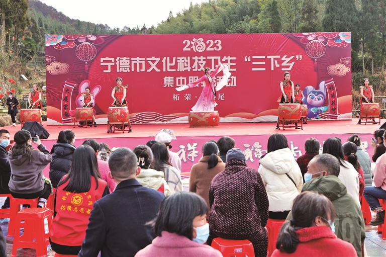 把文化送往农村、把技术送到田间、把健康送进农家,把党的二十大精神送入群众心中……1月12日,由市委宣传部等14家市直单位主办、80家市直单位联办的2023年宁德市文化科技卫生“三下乡”集中服务活动在柘荣县城郊乡靴岭尾村举行。