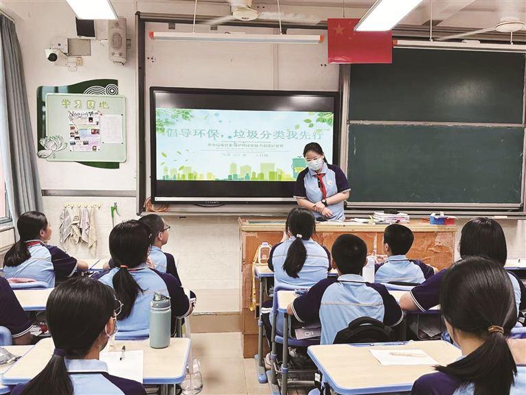 劳动委员在班会课上当“小老师”,向同学们讲解垃圾分类。