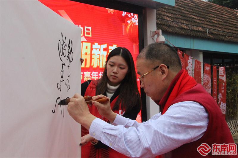 书法志愿者现场写春联(东南网记者 李霖 摄)